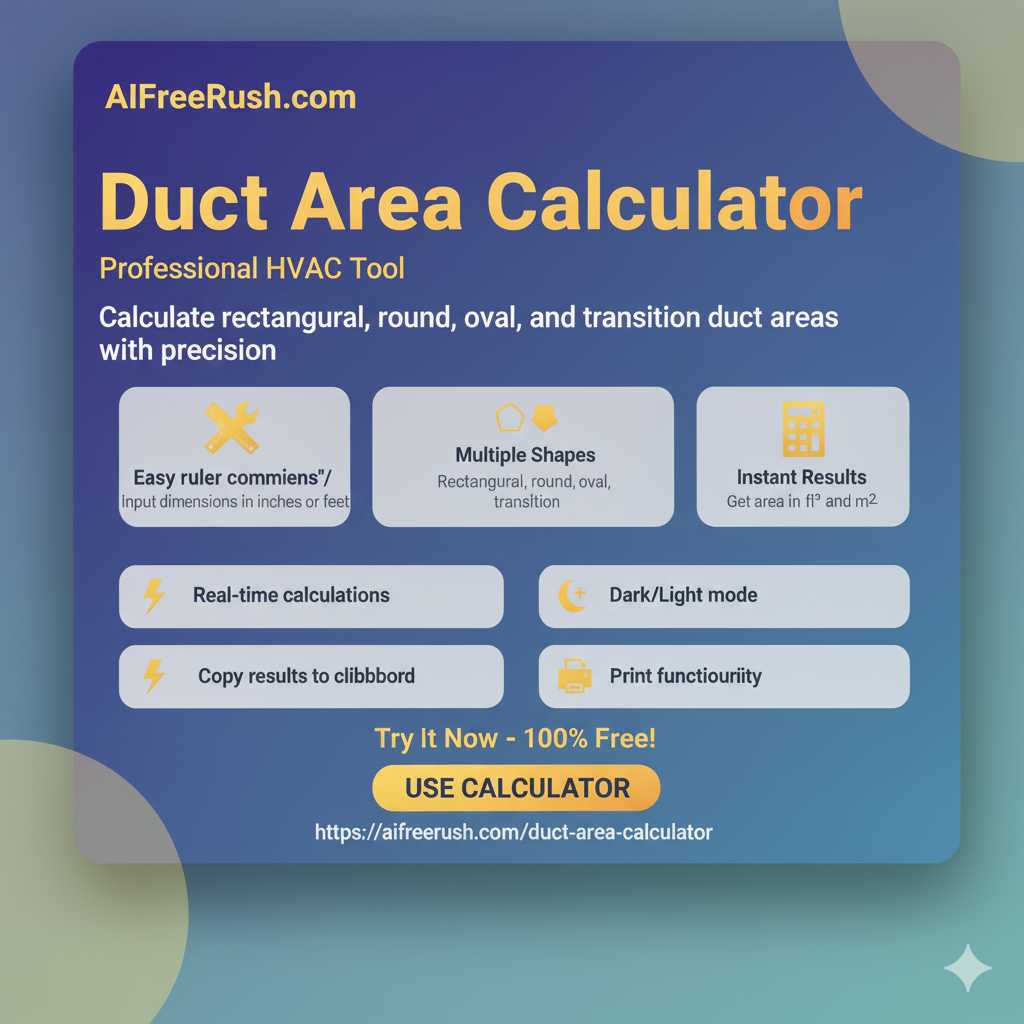 Calculate rectangular, round, oval, and transition duct areas with precision